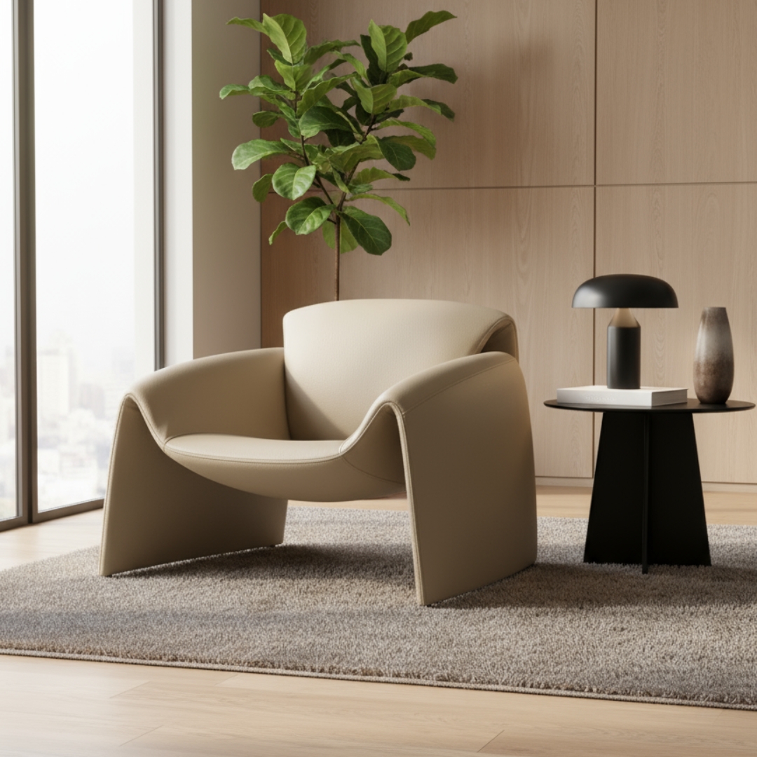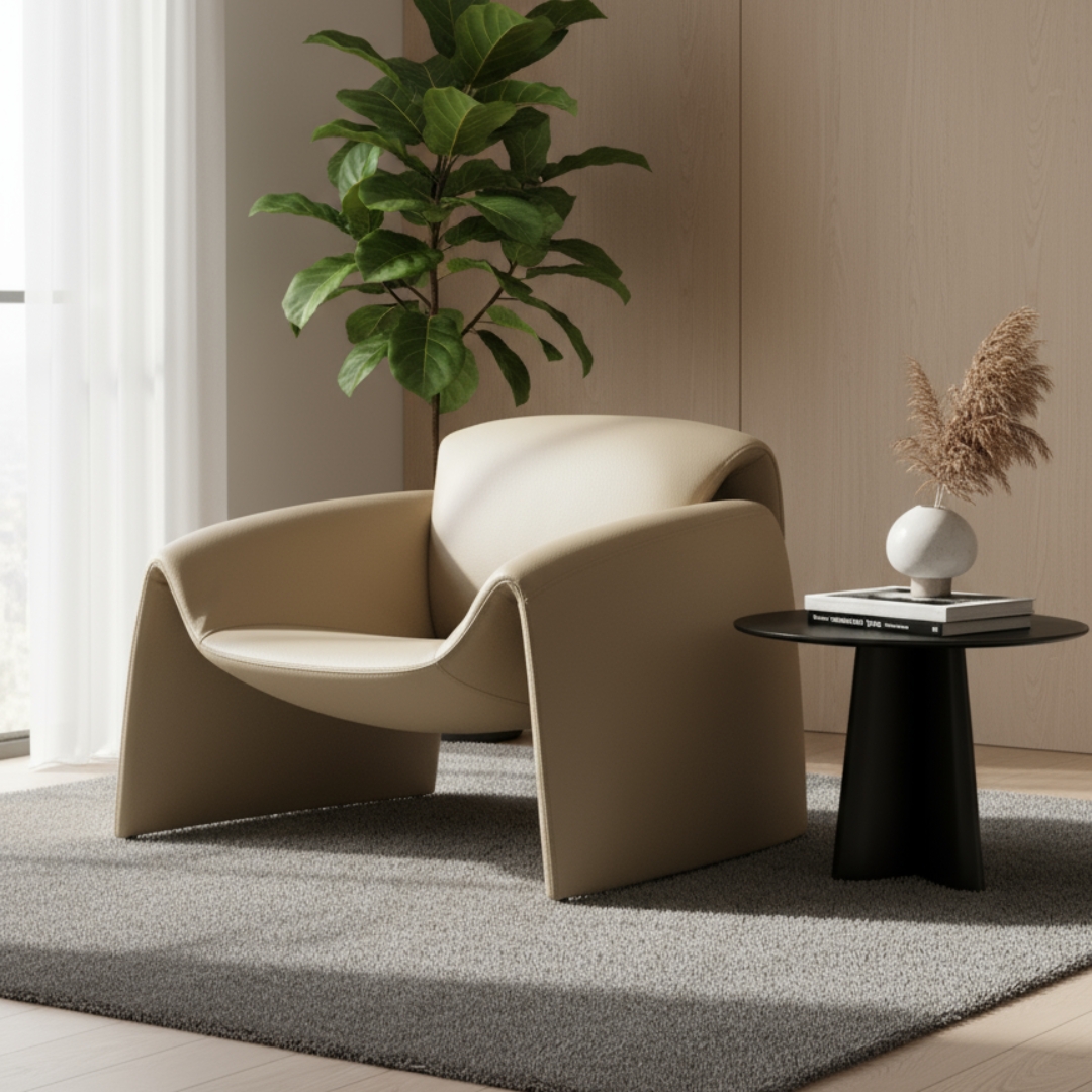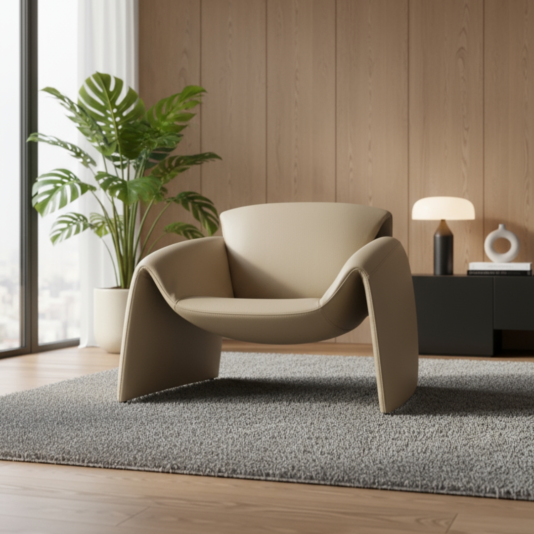 Monza fotelja je dizajnerski komad izuzetno modernog karaktera, kreiran da u prostoru bude akcenat koji privlači pogled. Njene bočne stranice formirane su u jednoj fluidnoj, savijenoj liniji, što daje vizuelnu dinamiku i utisak da fotelja „lebdi“ iznad poda. Minimalizam forme u kombinaciji sa skulpturalnim izgledom čini je pravim statement komadom za savremene enterijere.
