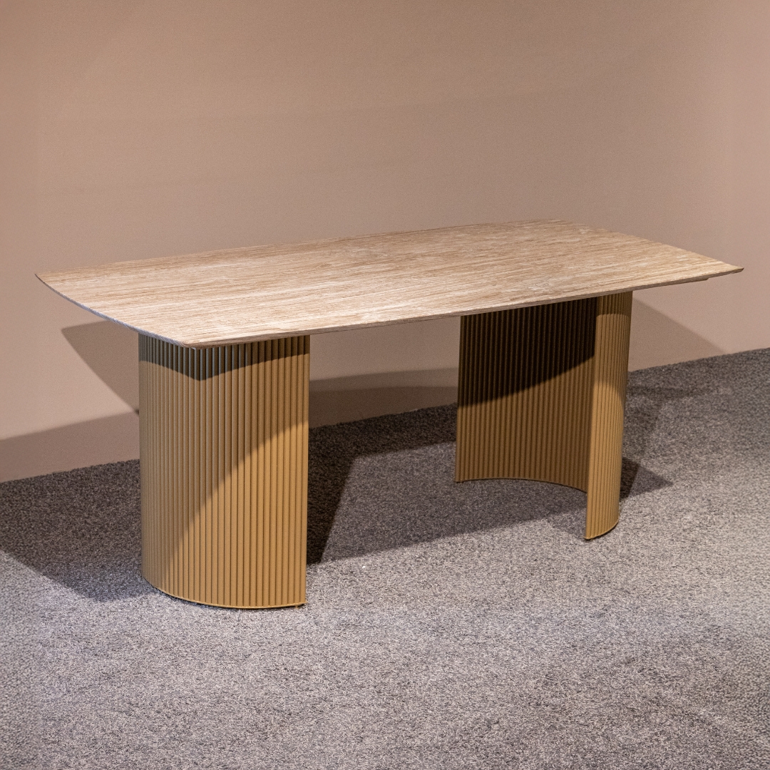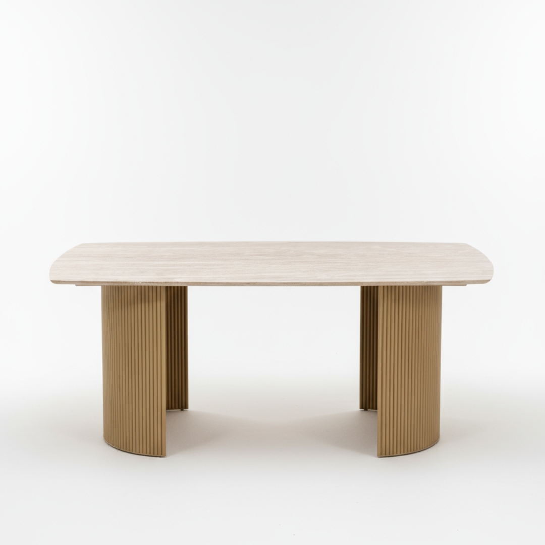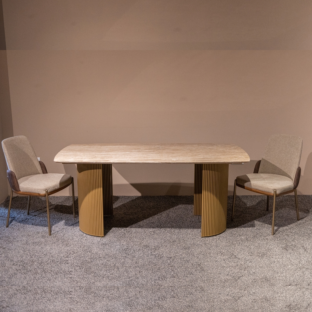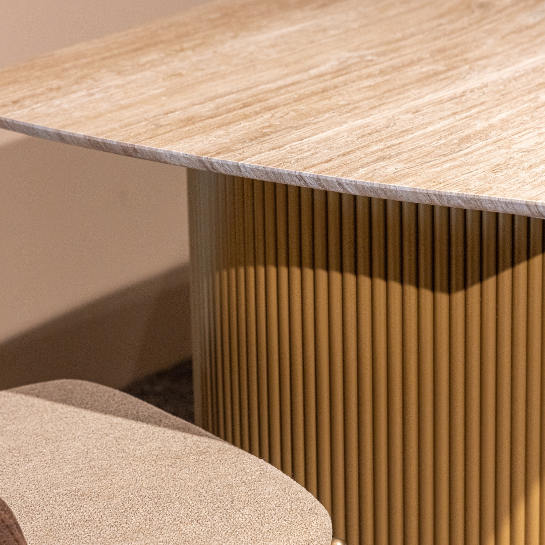 Traventino je trpezarijski sto koji spaja luksuz prirodnog kamena i modernu arhitektonsku formu. Njegova gornja ploča izrađena je od mermera, sa prepoznatljivom toplom teksturom i profinjenim, nežno zaobljenim ivicama koje donose eleganciju i taktilnu vrednost u prostoru.