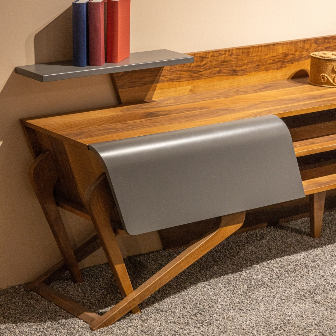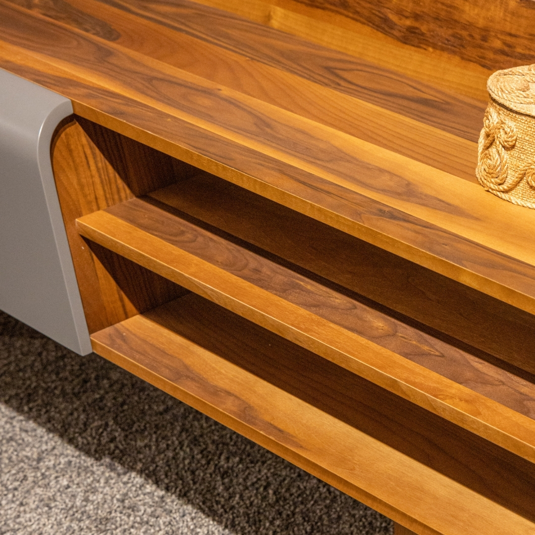 Royal TV sistem spaja modernu geometriju i toplinu prirodnih materijala u komad koji dominira prostorom svojom elegancijom. Izrađen od pažljivo birane kombinacije farbanog i furniranog medijapana, Royal donosi savršen balans između savremenog dizajna i prirodne teksture drveta. Masivne nogice dodatno naglašavaju stabilnost i luksuzni karakter, dok svojim jedinstvenim oblikom daju sistemu prepoznatljiv i upečatljiv vizuelni identitet.